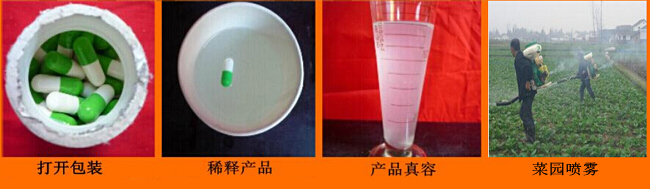 蔬菜壯莖靈膠囊:每瓶60粒,在15公斤--30公斤水中加本品膠囊一粒?墒故卟嗣玳L勢茂盛,桿莖粗壯、葉片肥厚,高產(chǎn)優(yōu)質(zhì)。保鮮期長。用于甘藍、芥菜、芹菜、黃花、大白菜、苴蓮、茼蒿、大青菜、韭菜、空心菜、菠菜、油麥菜等各種無公害蔬菜。對身價高的蔬菜品種可在15公斤水中加本膠囊2--3粒施用,效果更佳。本品PH值中性,遵照使用要求稀釋后噴霧,亦可以和各種農(nóng)藥及葉肥混合使用。稀釋液存放保質(zhì)期30天。